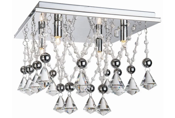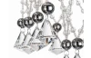 Stropní osvětlení doplňují dekorativní závěsné prvky ve tvarech křišťálů, které odrážejí paprsky světla.