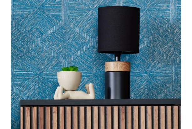 Tato elegantní stolní lampa zaujme svým krásným barevným provedením. Na matně černém válcovém podstavci z kovu s imitací textury a barvy dřeva je patice E14, kterou překrývá černé textilní stínidlo o průměru 14 cm. Díky svému unikátnímu vzhledu se stane nejen stylovým prvkem, ale také praktickým zdrojem světla pro různé účely. Celková výška 29 cm.
