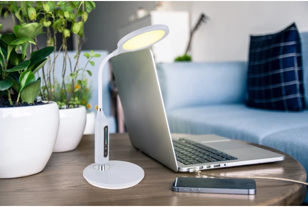 Moderní LED stolní lampa ze série Fruggy zaujme nejen svým designem, ale také funkcemi. Lampička o výšce 40,7 cm je vyrobena z matně šedého plastu a pochromovaného kovu. Barvu světla lze nastavit od teplého bílého světla až po denní studené světlo, které je ideální pro soustředění na práci. Lampu lze plynule stmívat ve 3 stupních jasu, vypínat a zapínat pomocí dotyku a díky paměťové funkci se uloží poslední zvolené nastavení osvětlení. Díky ohebnému ramenu lze světlo nasměrovat dle Vašich potřeb, a proto se lampička hodí ke čtení nebo na psací stůl.
