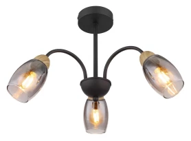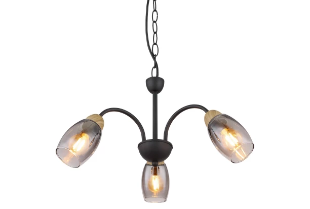 Závěsný stropní lustr se 3 svítidly zaujme svým designem a poskytne příjemnou světelnou atmosféru. Oválná kouřově zbarvená skleněná stínidla, ke kterým vedou zakřivená matně černá ramena z kovu, jsou na konci doplněna o dekor imitující dřevo. Závěsné osvětlení se hodí do obývacího pokoje.