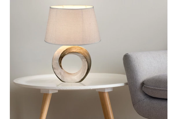 Tato elegantní stolní lampa zaujme svým krásným designem. Šedé látkové stínidlo a umělecký podstavec s otvorem v mramorovém vzhledu se skvěle doplňují. Stylové osvětlení, které poskytne útulnou atmosféru v ložnici nebo kdekoliv jinde.