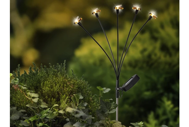 Dekorativní zahradní osvětlení s roztomilými LED včeličkami vytvoří ve vaší zahradě příjemnou a útulnou atmosféru. Skvěle vynikne podél cestiček, v záhonech, květináčích i na skalce, kde jemné teplé bílé světlo dodá prostoru kouzelný nádech. Díky solárnímu napájení je provoz úsporný a integrovaný senzor soumraku zajistí automatické rozsvícení po setmění. Svítidlo lze snadno zapíchnout do země pomocí hrotu. Výška 70 cm.