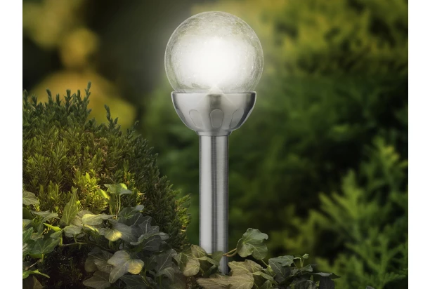 Zahradní LED lampa s elegantní skleněnou koulí s popraskaným efektem vytváří příjemnou a útulnou atmosféru v exteriéru. Skvěle se hodí pro osvětlení zahradních cestiček, záhonů i dalších venkovních prostor, kde poskytne jemné dekorativní světlo. Díky solárnímu napájení je její provoz úsporný a integrovaný senzor soumraku zajistí automatické rozsvícení při setmění. Svítidlo lze snadno zapíchnout do země pomocí hrotu.