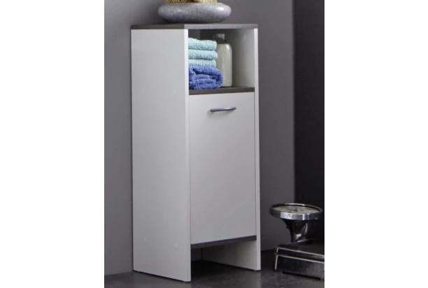 Koupelnová boční skříňka z řady California v kombinaci bílé barvy a kouřově šedého dubu prakticky poslouží v moderně i klasicky zařízené koupelně.