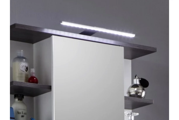 Horní LED osvětlení pro nasvícení koupelnové skříňky se zrcadlem, případně jakékoliv jiné skříňky nebo regálu. Včetně zásuvky s vypínačem, trafa i přívodového kabelu.
