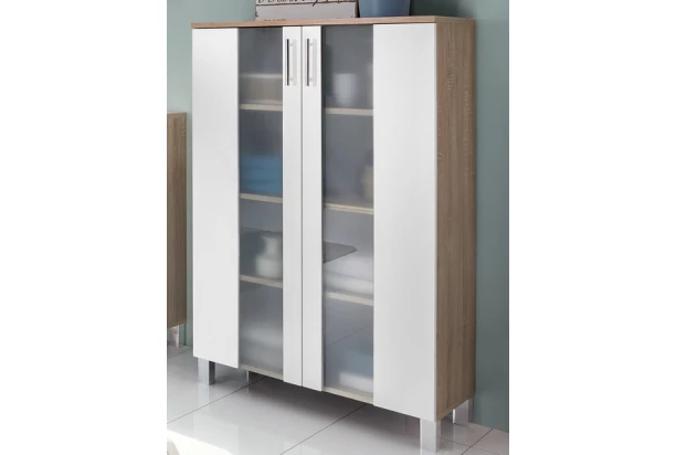 Skříňka o výšce 110 cm z řady Porto v oblíbené kombinaci dubu sonoma a bílé barvy má snadno udržovatelné povrchy. Satinované sklo v rámu předních ploch působí vzdušně a moderně. Vnitřní prostor můžete navíc libovolně doplnit o osvětlení, které vytvoří zajímavý efekt.