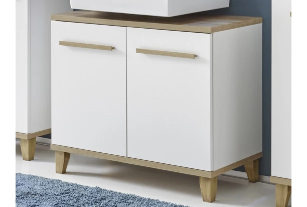 Koupelnová skříňka pod umyvadlo z modelové řady South v půvabném skandinávském stylu, který si zamilujete. Čisté bílé linie doplňuje útulný dubový dřevodekor s příjemně hnědými akcenty.