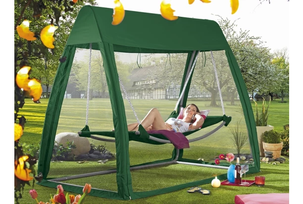 Skvělý zahradní stan obsahuje i komfortní houpací lehátko, na kterém si budete moct vychutnávat chvíle pohody plnými doušky.