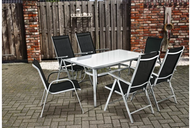 Jídelní stůl na zahradu či dvorek. Kovová konstrukce zajišťuje stabilitu a prosklená deska působí vzdušně.