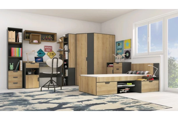 Komoda z programu Nano obsahuje praktické úložné prostory a zaujme svým vzhledem v kombinaci útulného dubového dekoru a grafitové barvy. Hodí se pro vybavení pokoje dětí, teenagerů i dospělých.