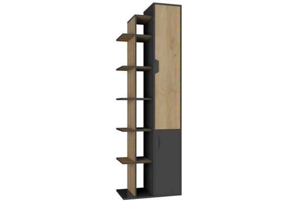 Vysoký regál s dveřmi z programu Nano obsahuje praktické úložné prostory a zaujme svým vzhledem v kombinaci útulného dubového dekoru a grafitové barvy. Hodí se pro vybavení pokoje dětí, teenagerů i dospělých.