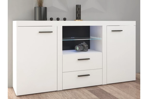 Komoda v trendovém stylu nabízí praktické úložné prostory i otevřené přihrádky pro umístění dekoračních předmětů nebo elektroniky, navíc se zásuvkami uprostřed. V bílém provedení a včetně LED osvětlení skleněné police.