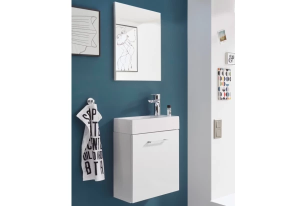 Praktická koupelnová sestava nábytku bílém provedení obsahuje závěsnou skříňku, umyvadlo i nástěnné zrcadlo. Svými kompaktními rozměry je nábytek ideální i do menšího prostoru koupelny, wc nebo prádelny.
