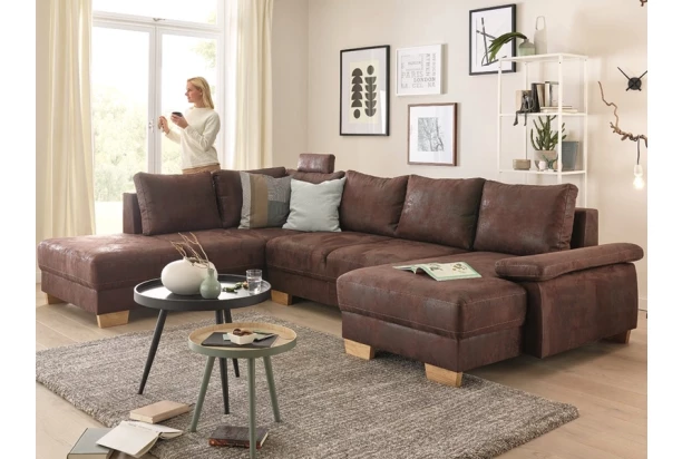 Komfortní a prostorná sedací souprava ve tvaru U s velkými opěrnými polštáři, funkcí rozkladu na lůžko i úložným prostorem. Potažena do unikátní látky s vintage optikou obroušené kůže, která bude skvěle působit ve stylově zařízeném interieru.