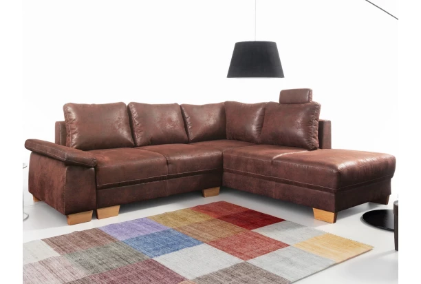 Komfortní a prostorná rohová sedací souprava s velkými opěrnými polštáři, funkcí rozkladu na lůžko i úložným prostorem. Potažena do unikátní látky s vintage optikou obroušené kůže, která bude skvěle působit ve stylově zařízeném interieru. Varianta sedačky tvořící pravý roh.