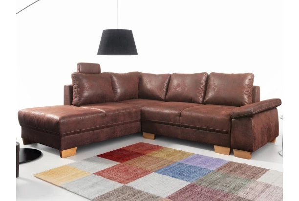 Komfortní a prostorná rohová sedací souprava s velkými opěrnými polštáři, funkcí rozkladu na lůžko i úložným prostorem. Potažena do unikátní látky s vintage optikou obroušené kůže, která bude skvěle působit ve stylově zařízeném interieru. Varianta sedačky tvořící levý roh.