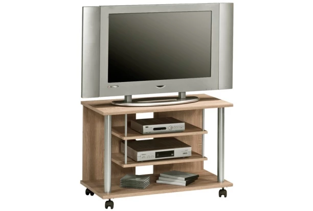 Univerzální TV stolek v dekoru dub sonoma má stabilní konstrukci na kolečkách a sadu odkládacích přihrádek pro snadné umístění domácí elektroniky i drobností.