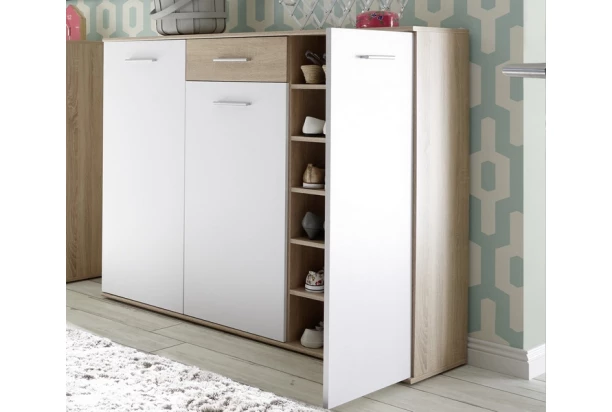 Univerzální 3-dveřová komoda se zásuvkou a mnoha vnitřními policemi je ideálně využitelná i jako přehledný botník. Konstrukce o šířce 136 cm vyrobena v oblíbené kombinaci dubu sonoma a bílé barvy.
