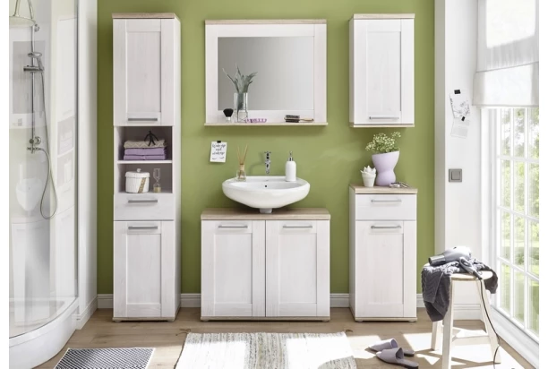 Koupelnová stojací skříňka z kolekce Romance – romantické kouzlo nábytku v elegantním venkovském stylu podtrhují dekorativní reliéfy předních ploch a kombinace běleného sibiřského modřínu s útulnými tóny dubového dřevodekoru.