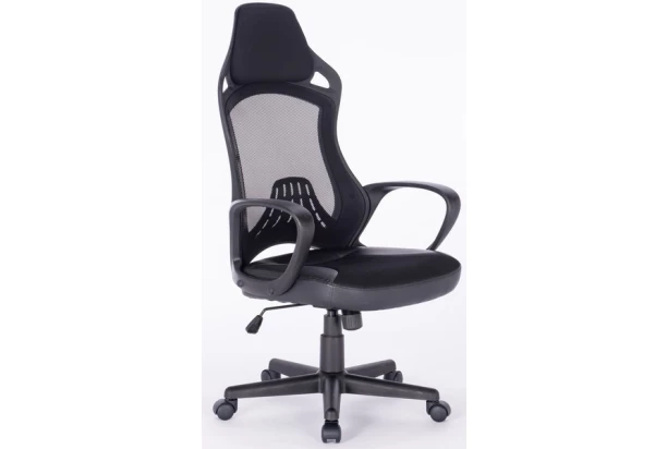 Oble tvarovaná kancelářská židle je vybavena bederní opěrkou a vysokým opěradlem s polstrovanou opěrkou hlavy. Potažena kombinací černé ekokůže a síťoviny pro ventilaci v oblasti zad.