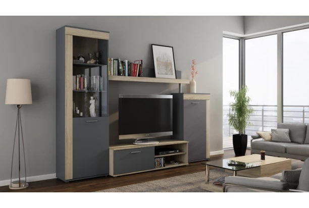 Obývací stěna v působivé kombinaci grafitové barvy a dřevodekoru dub sonoma. Přední lišty podtrhují kompaktní design celé sestavy nábytku.