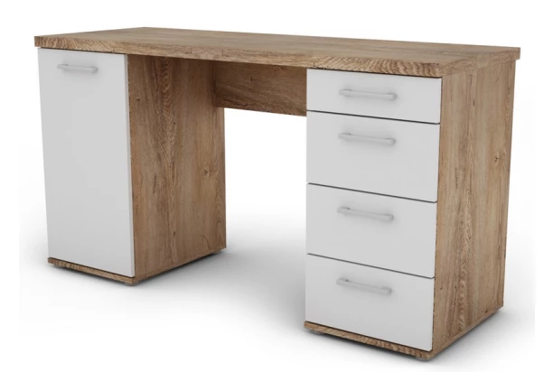 Prostorný psací stůl s pevnou konstrukcí má levé dveře s úložným prostorem a řadu zásuvek, kam přehledně uložíte vše potřebné. Vyroben v kombinaci dekoru dub burgund a bílé barvy.