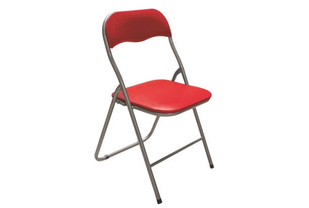 Praktická židle se skládací kovovou konstrukcí a sedákem potaženým červenou ekokůží. Snadno složíte a uložíte v případě potřeby.