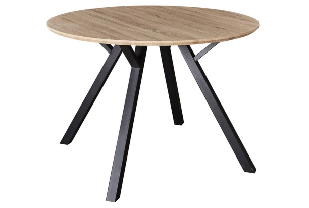 Kulatý jídelní stůl v moderním designu z kombinace dubu sonoma a černě lakovaného kovu. Zajímavě tvarovaná podnož zaujme na pohled.