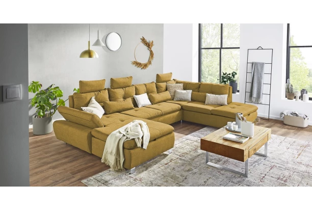 Prostorná trendová sedací souprava s půdorysem ve tvaru pravé U obsahuje funkci rozkladu na lůžko, dva různé úložné prostory, polohovatelnou područku, polštáře i tři opěrky hlavy, které můžete libovolně umístit na jakoukoliv část sedačky. Očalouněna příjemně měkkou látkou v odstínu hořčicová žlutá.