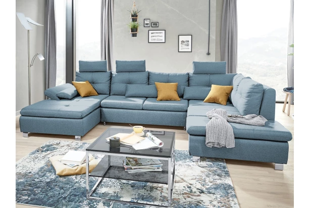 Prostorná trendová sedací souprava s půdorysem ve tvaru pravé U obsahuje funkci rozkladu na lůžko, dva různé úložné prostory, polohovatelnou područku, polštáře i tři opěrky hlavy, které můžete libovolně umístit na jakoukoliv část sedačky. Očalouněna příjemně měkkou látkou v odstínu tyrkysová.