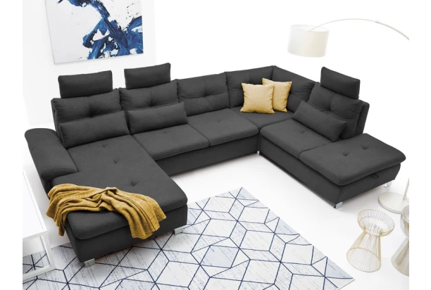 Prostorná trendová sedací souprava s půdorysem ve tvaru pravé U obsahuje funkci rozkladu na lůžko, dva různé úložné prostory, polohovatelnou područku, polštáře i tři opěrky hlavy, které můžete libovolně umístit na jakoukoliv část sedačky. Očalouněna příjemně měkkou látkou v odstínu tmavá šedá.