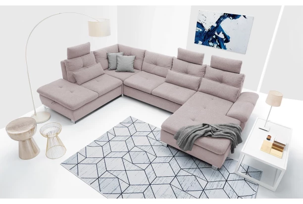 Prostorná trendová sedací souprava s půdorysem ve tvaru levé U obsahuje funkci rozkladu na lůžko, dva různé úložné prostory, polohovatelnou područku, polštáře i tři opěrky hlavy, které můžete libovolně umístit na jakoukoliv část sedačky. Očalouněna příjemně měkkou látkou v odstínu světle růžová.