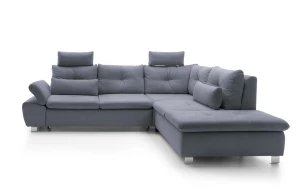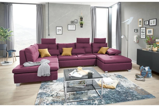 Prostorná trendová sedací souprava s půdorysem ve tvaru levé U obsahuje funkci rozkladu na lůžko, dva různé úložné prostory, polohovatelnou područku, polštáře i tři opěrky hlavy, které můžete libovolně umístit na jakoukoliv část sedačky. Očalouněna příjemně měkkou látkou v odstínu fialová lila.