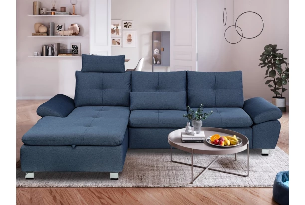 Trendová rohová sedačka s otomanem vytváří levý roh a obsahuje funkci rozkladu na lůžko, úložný prostor, polohovatelné područky, polštáře i opěrku hlavy, kterou můžete libovolně umístit na jakoukoliv část sedačky. Očalouněna příjemně odolnou látkou v odstínu námořnická modrá.