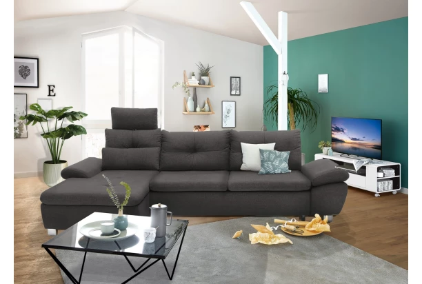 Trendovní rohová sedačka s levým otomanem obsahuje funkci rozkladu na lůžko, úložný prostor, polohovatelné područky, polštáře i opěrku hlavy, kterou můžete libovolně umístit na jakoukoliv část sedačky. Očalouněna příjemně měkkou látkou v tmavém šedém odstínu.