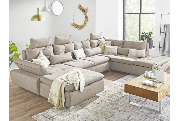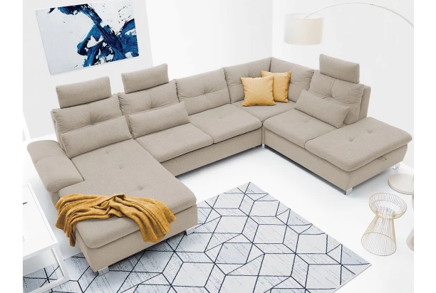 Prostorná trendová sedací souprava s půdorysem ve tvaru pravé U obsahuje funkci rozkladu na lůžko, dva různé úložné prostory, polohovatelnou područku, polštáře i tři opěrky hlavy, které můžete libovolně umístit na jakoukoliv část sedačky. Očalouněna příjemně měkkou látkou v odstínu světle béžová.