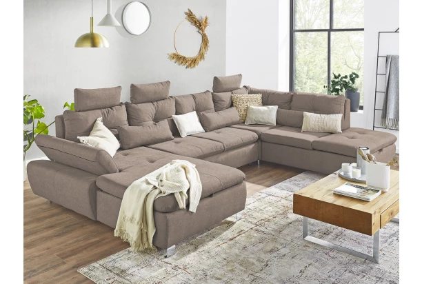 Prostorná trendová sedací souprava s půdorysem ve tvaru pravé U obsahuje funkci rozkladu na lůžko, dva různé úložné prostory, polohovatelnou područku, polštáře i tři opěrky hlavy, které můžete libovolně umístit na jakoukoliv část sedačky. Očalouněna příjemně měkkou látkou v odstínu světle hnědá.