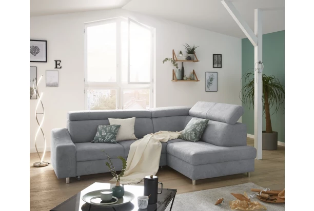 Moderní rohová sedací souprava elegantních tvarů nabídne komfort bez kompromisu i v menším obývacím pokoji. Vysoký opěrák, nastavitelné zádové opěrky, úložný prostor i funkce rozkladu vám zpříjemní každodenní pohodu. Sedačka je očalouněna měkkou strukturovanou látkou v barvě světle šedá. Varianta sedačky s otomanem tvoří pravý roh.