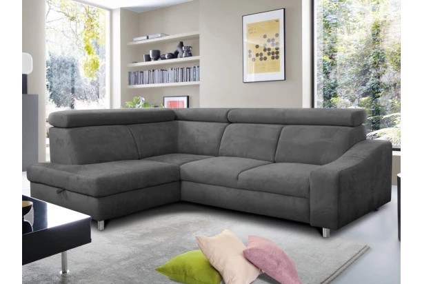 Moderní rohová sedací souprava elegantních tvarů nabídne komfort bez kompromisu i v menším obývacím pokoji. Vysoký opěrák, nastavitelné zádové opěrky, úložný prostor i funkce rozkladu vám zpříjemní každodenní pohodu. Sedačka je očalouněna měkkou strukturovanou látkou v barvě středně šedá. Varianta sedačky s otomanem tvoří levý roh.