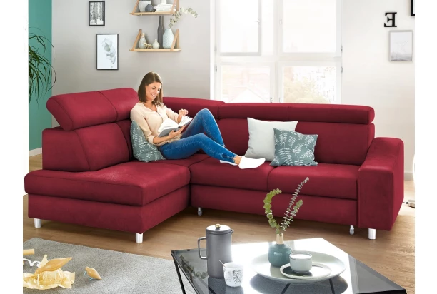 Moderní rohová sedací souprava elegantních tvarů nabídne komfort bez kompromisu i v menším obývacím pokoji. Vysoký opěrák, nastavitelné zádové opěrky, úložný prostor i funkce rozkladu vám zpříjemní každodenní pohodu. Sedačka je očalouněna měkkou strukturovanou látkou v barvě šípkově červená. Varianta sedačky s otomanem tvoří levý roh.