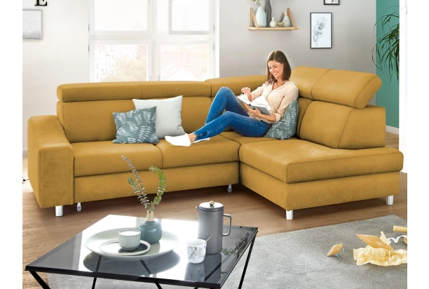 Moderní rohová sedací souprava elegantních tvarů nabídne komfort bez kompromisu i v menším obývacím pokoji. Vysoký opěrák, nastavitelné zádové opěrky, úložný prostor i funkce rozkladu vám zpříjemní každodenní pohodu. Sedačka je očalouněna měkkou strukturovanou látkou v barvě žlutá kari. Varianta sedačky s otomanem tvoří pravý roh.