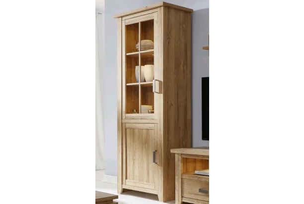 Úzká vitrína z modelové řady Canyon – nábytek tradičního vzhledu v útulném medovém odstínu dřevodekoru dub. Široké rámy a profilace předních ploch navíc působí masivně. Kombinací jednotlivých dílů nábytku dosáhnete praktického a zároveň velmi příjemného domácího prostředí v jakémkoliv pokoji.