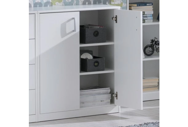 Skříňka z programu Mega v bílém dekoru – variabilní program nábytku Mega je zcela univerzální a vhodný pro zařízení každé místnosti. Kombinujte mezi sebou jednotlivé díly a vytvořte si tak doma prostředí podle své vlastní fantazie, potřeb a prostorových možností.
