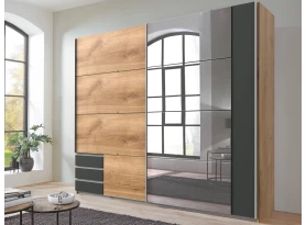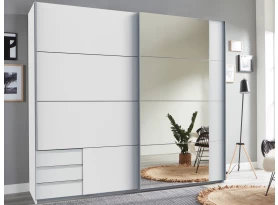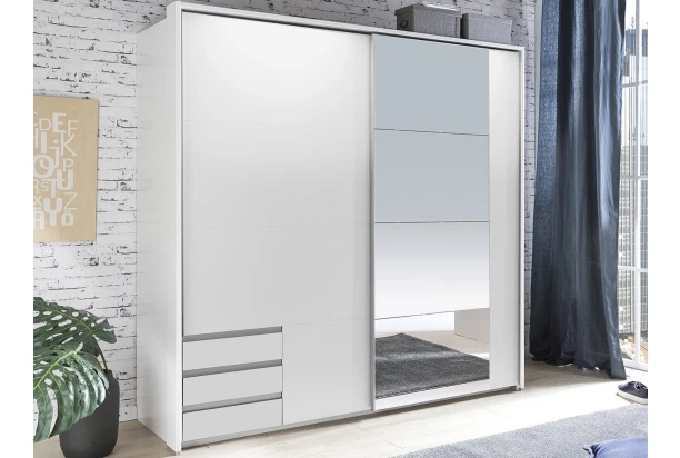 Šatní skříň v moderním designu osloví moderně založené osoby. Konstrukce o šířce 179 cm osahuje 2 posuvné dveře, zrcadlo a 3 zásuvky. Vyrobena v provedení bílá.