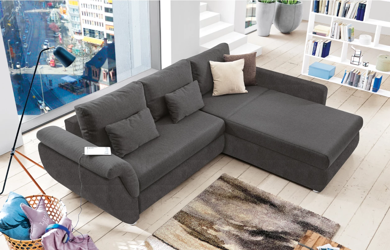 Zaoblená rohová sedací souprava s příjemně měkkými polštáři pro útulnou domácí pohodu. Díky funkci rozkladu se sedačka snadno promění v lůžko pro příležitostné spaní. Otoman můžete univerzálně smontovat na pravou nebo levou stranu – najde tak snadno místo v jakékoliv místnosti. V kombinaci šedá/světle šedá tkanina.