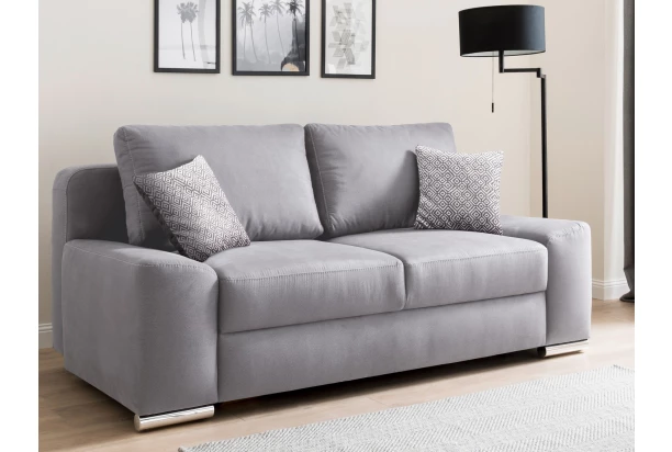 Moderní a prostorná pohovka s rozkládací funkcí je určena také pro trvalé spaní. Nabízí pohodlné sezení pro všechny věkové skupiny – komfortně měkký sedák má vyšší polohu a vstávání z pohovky je tak snazší. V úložném prostoru najdete navíc i pěnový topper jako doplněk pro měkké spaní. Pohovka je očalouněna světle šedou látkou v optice broušené kůže a doplněna polštářky se vzorem.