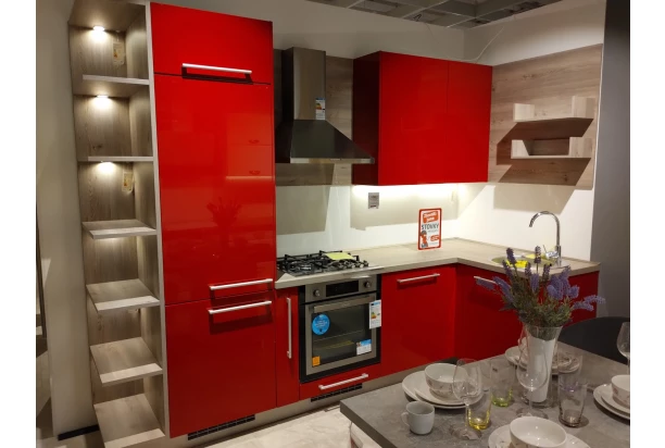 Kompletní sestava kuchyně Keid – extra výhodný výprodej vystaveného zboží z prodejny Teplice. V dekoru dub nelson/červená lesk.