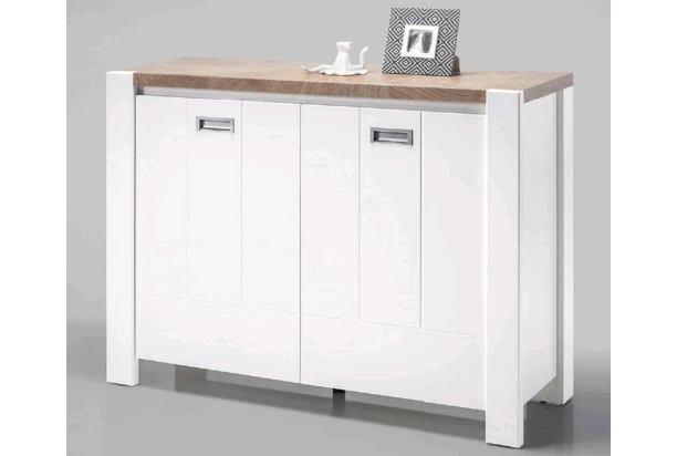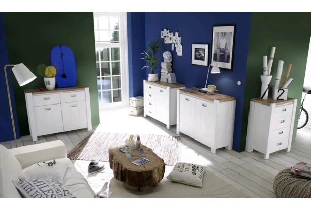 Nízká komoda z kolekce Melly s nádechem oblíbeného venkovského stylu – přední plochy s efektem dřevěných spár a optika širokých rámů vypadá opravdu působivě. Z jednotlivých elementů nábytku Melly si tak snadno zařídíte stylový interier.