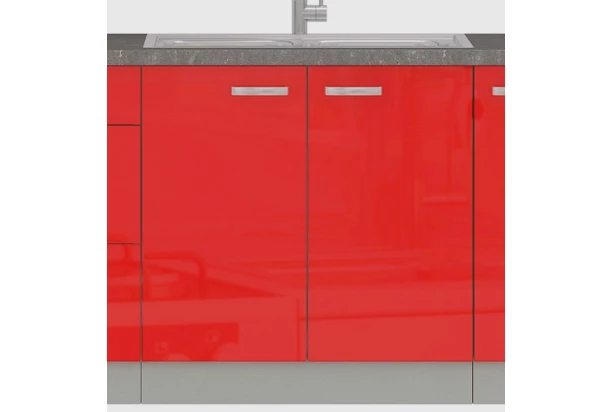 Kuchyňská dřezová skříňka o šířce 80 cm z programu Rose v jednoduchém, funkčním a zároveň moderním stylu. Přední plochy v červeném vysokém lesku. Různé elementy kuchyňského programu Rose můžete mezi sebou libovolně kombinovat a sestavit si tak libovolně velkou kuchyni podle vašich individuálních potřeb a prostorových možností.