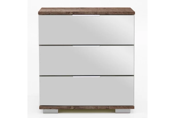 Vysoký noční stolek z programu Easy Plus nabízí 3 prostorné zásuvky nad sebou. V kombinaci dekoru bahenní dub se zrcadlem na předních plochách působí luxusně.
